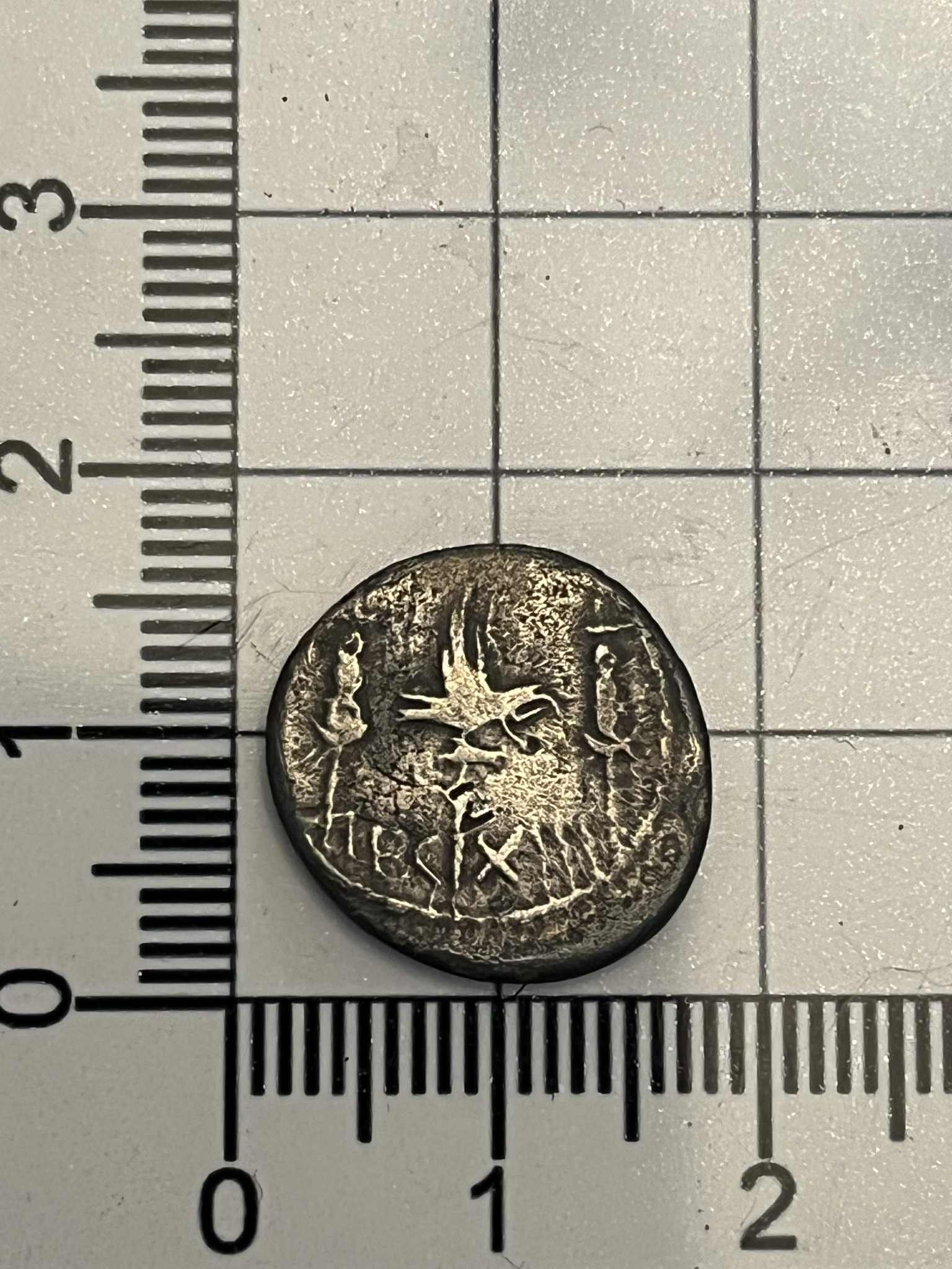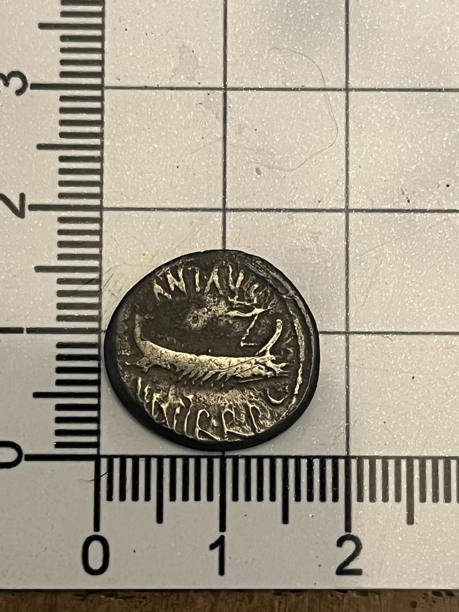 However, there was one stand out find that excited everyone and eclipsed all others. It was the only nomination by members when it came to nominating Find of the Day. It was Greg’s Mark Antony (Marcus Antonius) silver denarius from 31 BCE. These were known as galley or legionnaire denarii and this one is from the thirteenth legion. It shows the eagle, representing Jupiter, between two standards. It was minted in a travelling mint probably in Greece while Mark Antony was encamped with his army. This coin dates from the legendary time of his relationship with Cleopatra of Egypt.