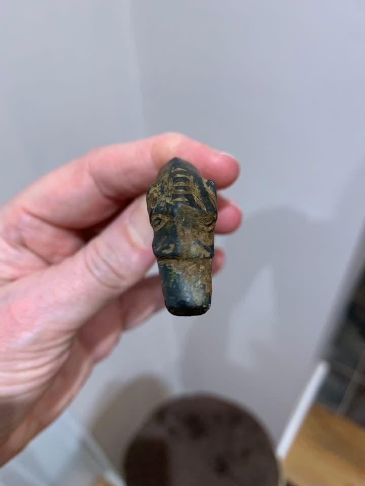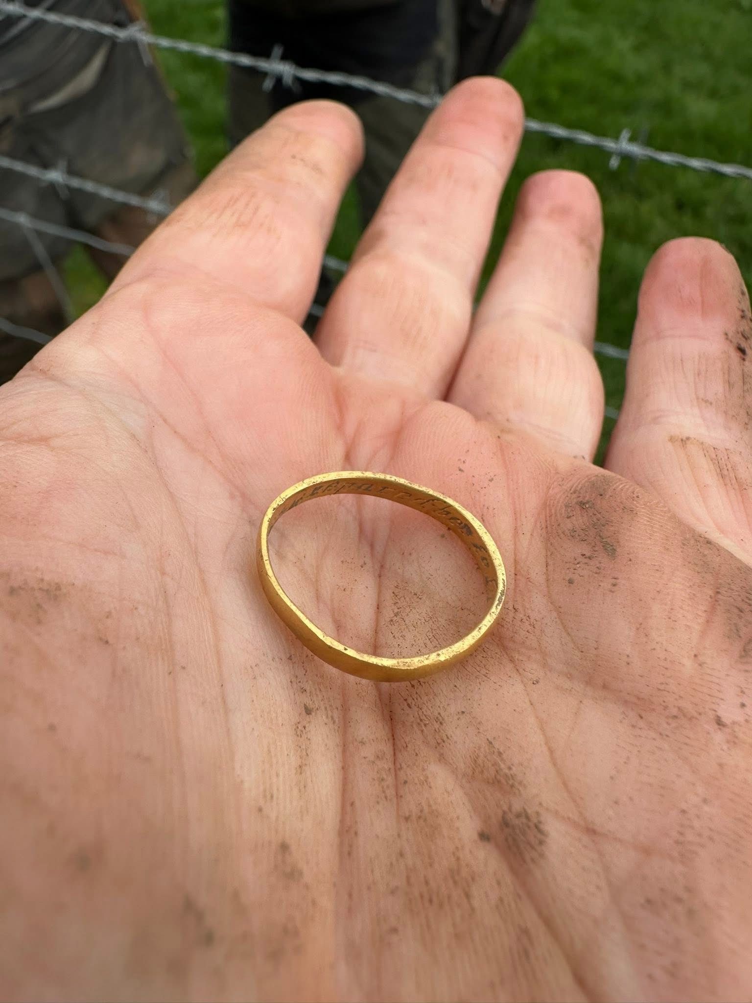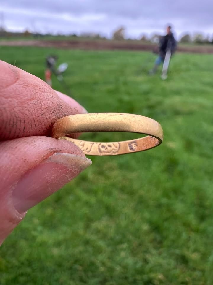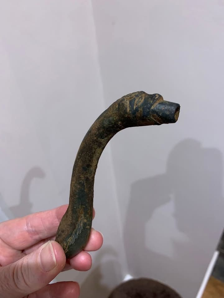 This was a new farm for the club and it didn’t disappoint! Nearly 40 acres of pasture that was described by one member as ‘digging through butter’! The weather stayed fair for much of the dig and a wide range of interesting finds came up. A number of hammered coins, silver coins, a solid cast 16/17 C crotal bell, a toy canon and a servant’s bell, among them. Any of these might have been considered for Find of the Day, had it not been for two outstanding items: Deb’s stunning zoomorphic spout (c 1400-1500) & Sarah’s beautiful gold memento mori ring, yet to be dated but thought to be of significant age.