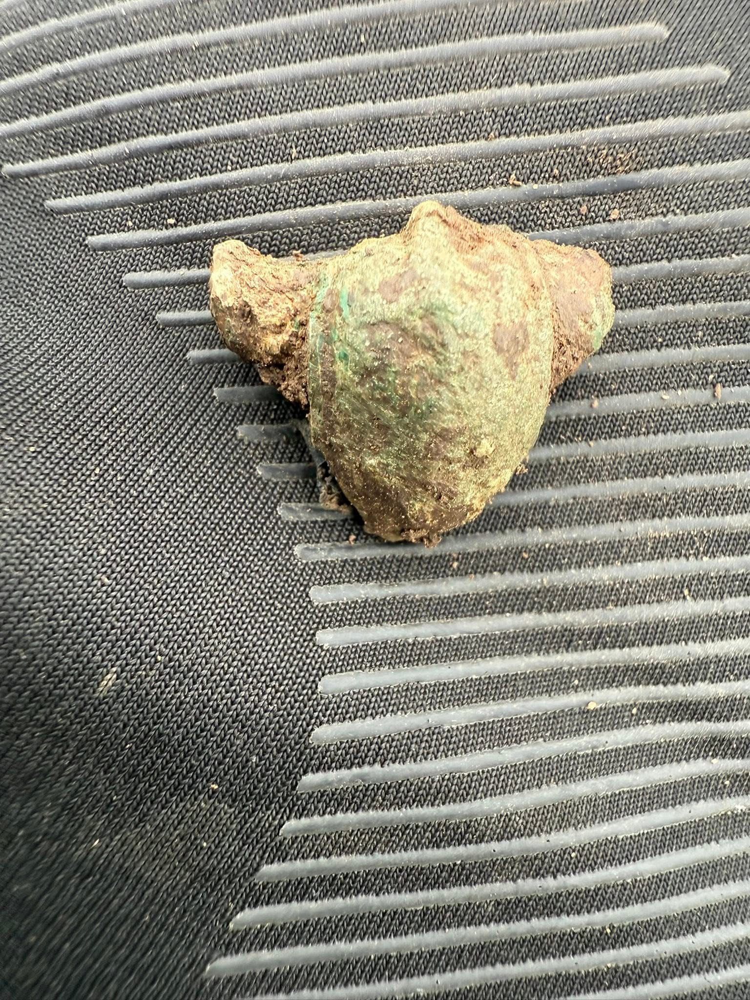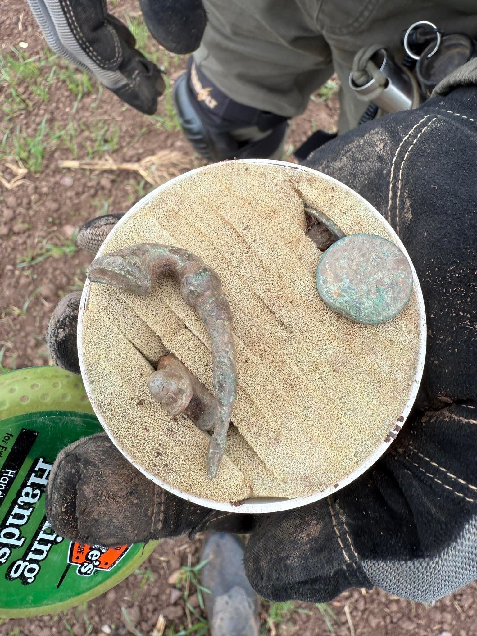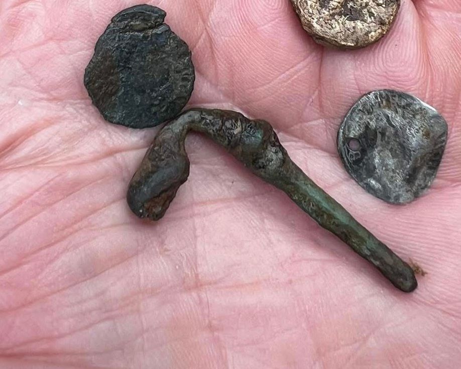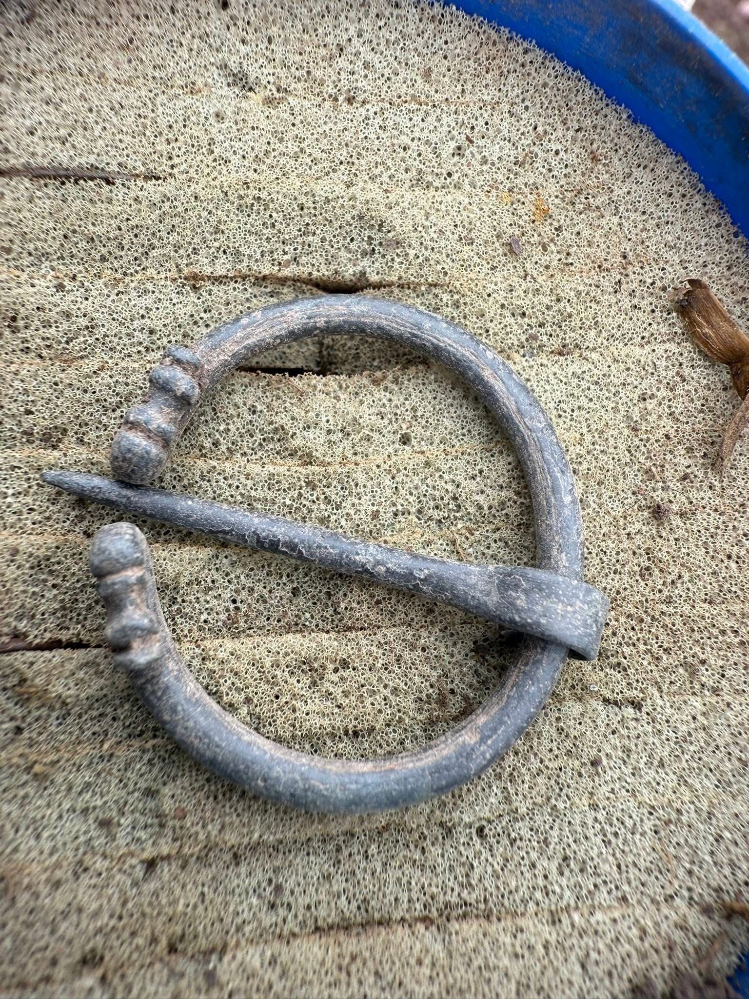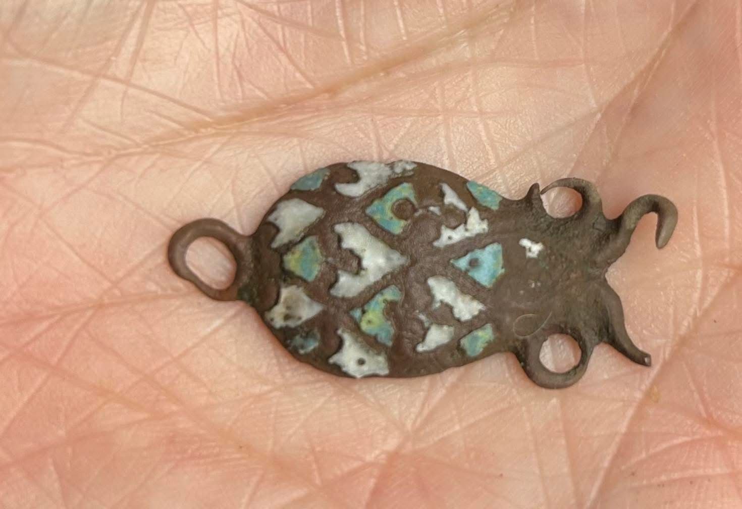 Spirits were high and after a slow start there were some lovely finds. Among them was Amanda’s enamel brooch/pendant, Tony’s fibula, Leon’s small fibula, Bill’s trumpet brooch, and these four are featured in photos below. There were also some hammered coins and Roman coins.